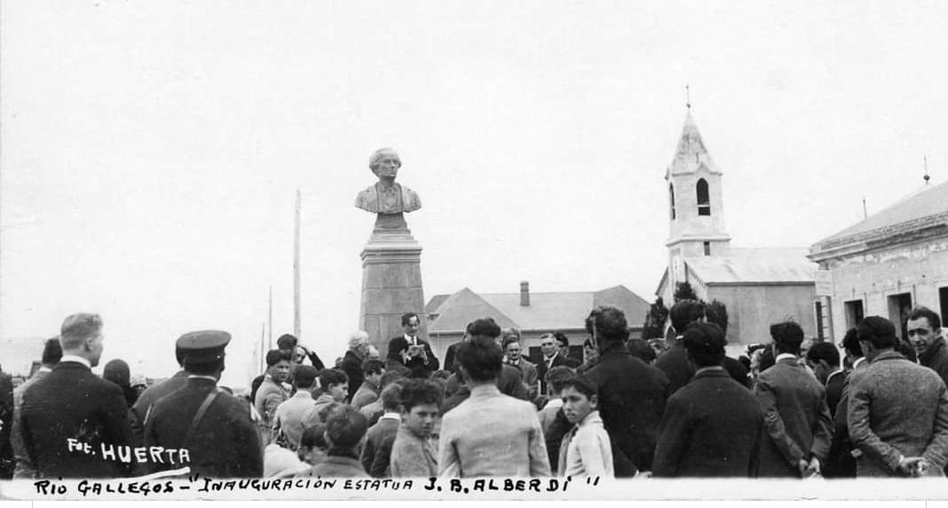 El 6 de enero del 1929 se lleva a cabo la inauguración. En la foto de arriba, se puede ver al escritor Juan Hilarión Lenzi, leyendo el discurso oficial en la ceremonia del emplazamiento del busto de Alberdi en el casco céntrico de Río Gallegos. De fondo, puede verse la Catedral, otro símbolo de la avenida.