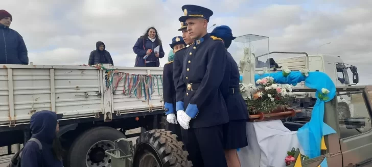 Mientras tanto, la figura de la Virgen de Güer Aike que acompaña a los feligreses se traslada custodiada por cadetes de la Escuela de Policía de Santa Cruz a bordo de un jeep del Ejército Argentino.
