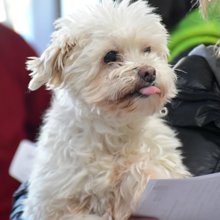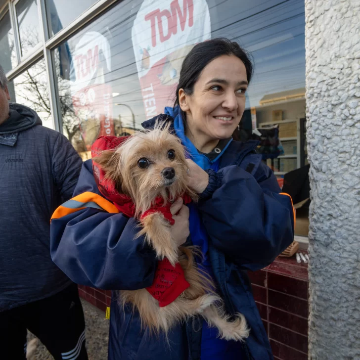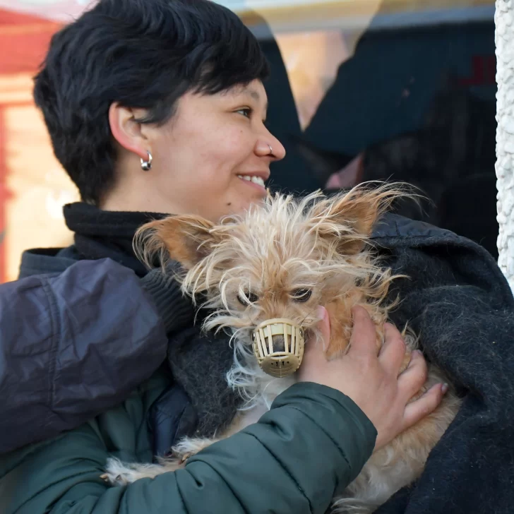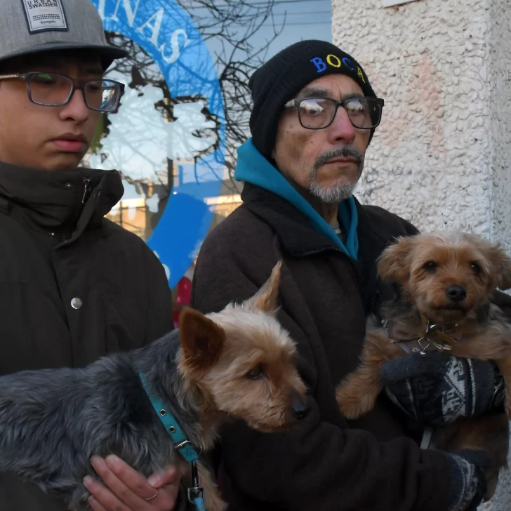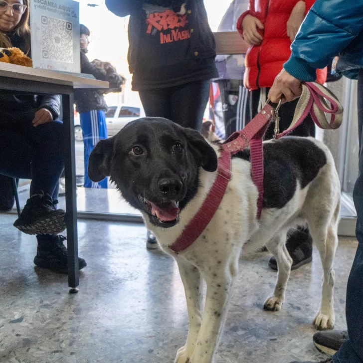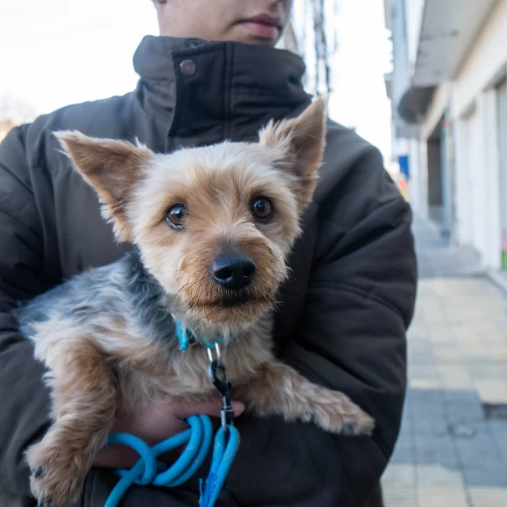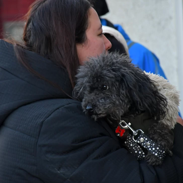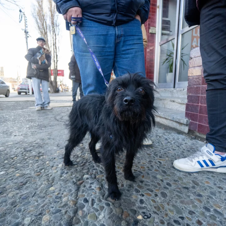 “Osita”, una perrita cordobesa de un año y un mes, llegó con su dueño Leo para que le apliquen la vacuna antirrábica. “Vivía en Córdoba, allá la adopté, la habían dejado en una cajita en una plaza abandonada con sus hermanitas. La publicaron en redes sociales y con mi novia la adoptamos y ahora vive con nosotros”, relató y sobre cómo se aclimató al sur, destacó “le encantó la nieve”.