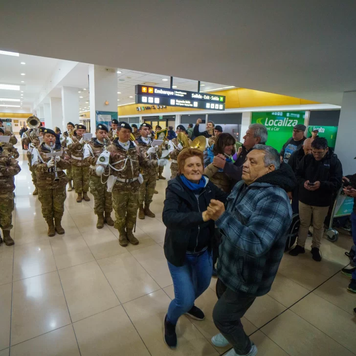 En su ingreso al Aeropuerto Internacional “Piloto Norberto Fernández” de Río Gallegos, la Banda del Ejército “Combatientes del Atlántico Sur” lo recibió con la Marcha de Malvinas.