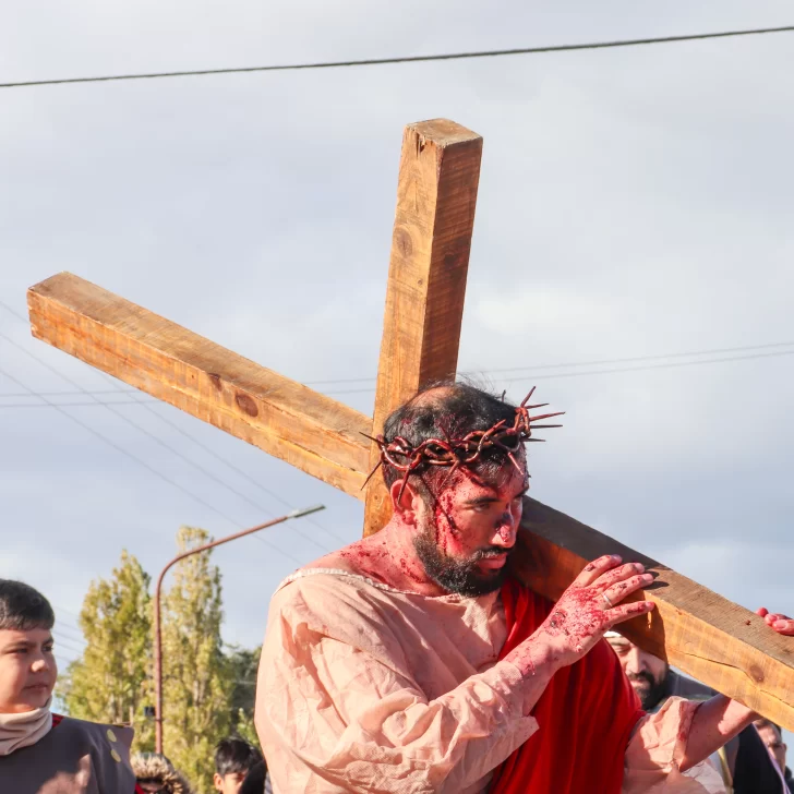 “A las 15:00 en la mayoría de las parroquias se celebra la adoración de la cruz, es el momento en el cual litúrgicamente recordamos y revivimos la pasión y muerte del señor. Luego de la celebración, salimos a la calle con esta representación del vía crucis”, comentó el sacerdote Luis Hetze a La Opinión Austral.