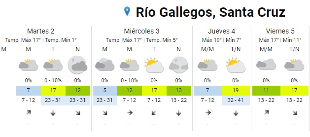 Para este miércoles en Río Gallegos, en tanto, desde el Servicio Meteorológico Nacional prevén una jornada con cielo parcialmente nublado y una temperatura que estará entre los 5 grados de mínima y los 17 de máxima.