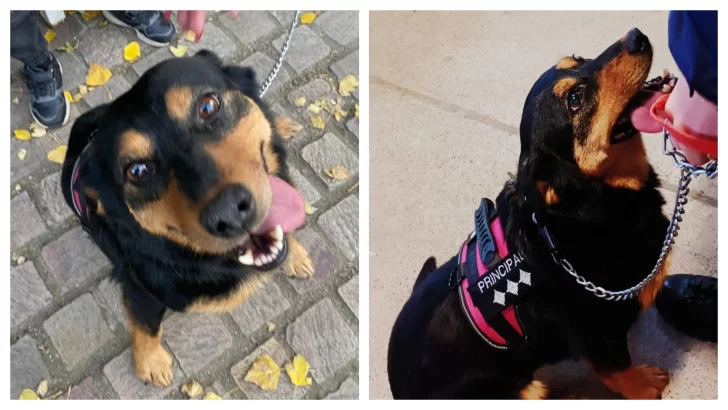 En la imagen se puede ver a una perrita de pelaje color negro con marrón y con un pretal de color rojo con negro sobre el cual se inscribe su nombre: “Principal”.
