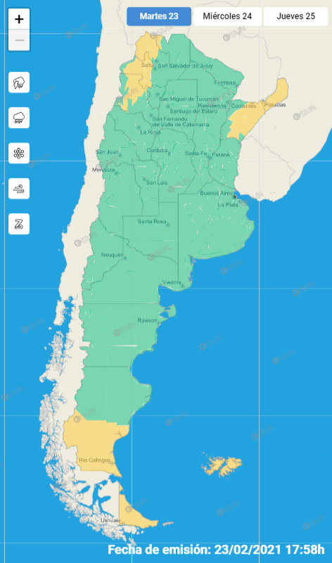 El Servicio Meteorológico Nacional emitió el lunes el alerta amarilla, el cual pronosticaba “una intensificación de vientos del sector oeste, rotando progresivamente al sudoeste, con velocidades entre 45 y 70 km/h y ráfagas máximas de 80 a 100 km/h”.