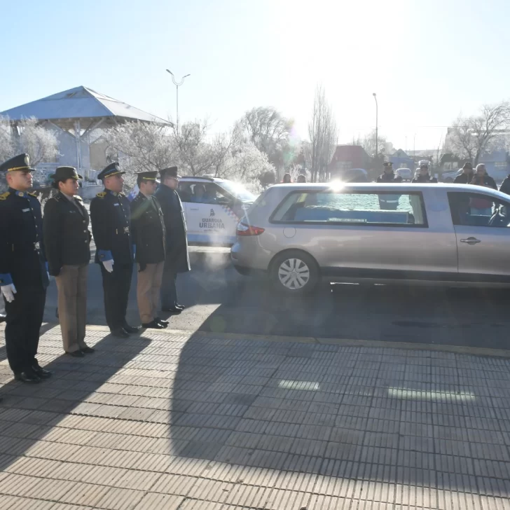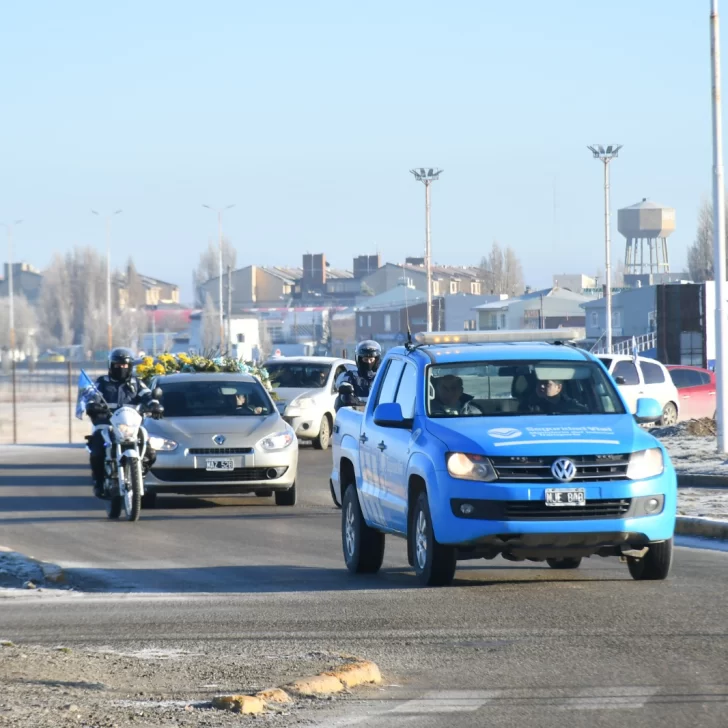 Minutos más tarde, llegaron hasta el Monumento a los Caídos en Malvinas, allí fueron recibidos por una guardia de la Policía de la Provincia. El cortejo frenó unos minutos para luego encarar los metros finales hacia el cementerio local.
