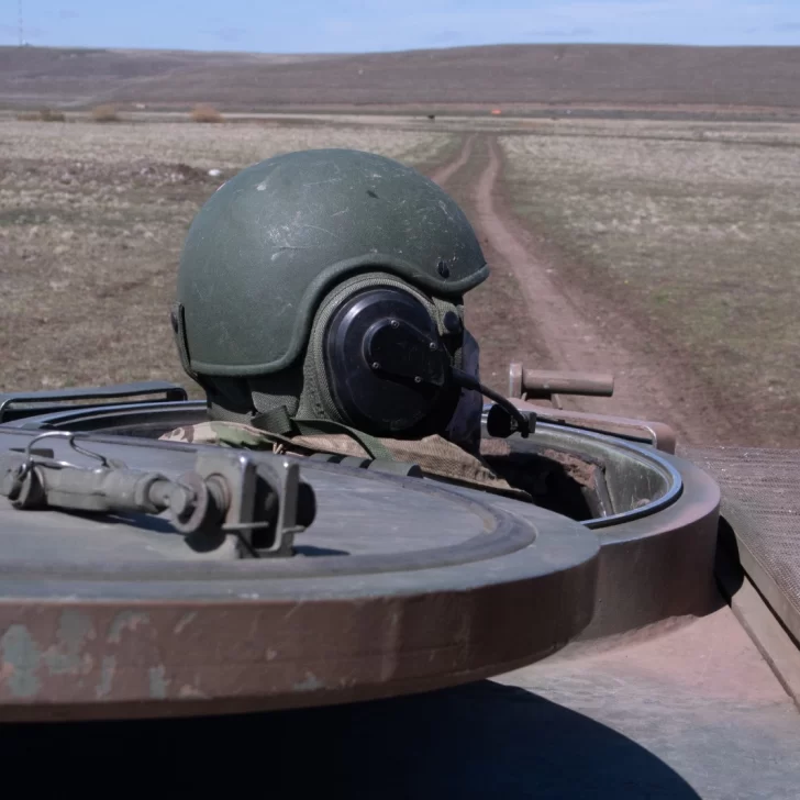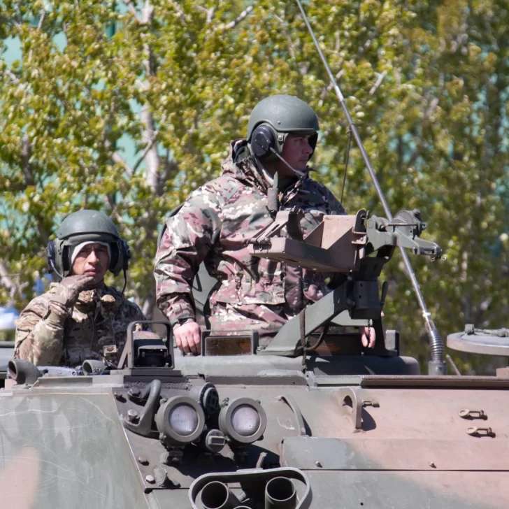Tras el almuerzo que incluyó empanadas, locro militar y dulce de batata con queso como postre, era momento de ir hacia Turbio Viejo. Exactamente a las 13:55 subimos a un vehículo M113, un transporte blindado de personal con un arma calibre 12,7 milímetros perteneciente a la infantería mecanizada, lo que comúnmente conocemos como “tanque de guerra”. La tripulación está compuesta por el conductor, el apuntador, el radio-operador y el jefe de vehículo.