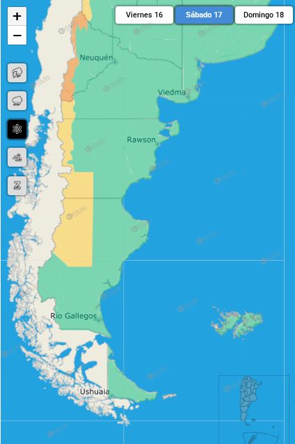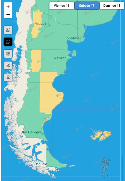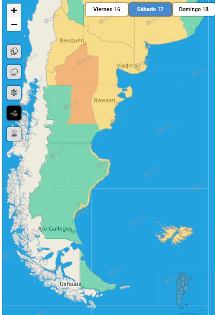También el 17 de mayo, las costas de los departamentos de Magallanes, Deseado y Corpen Aike estarán expuestas a vientos del sur con velocidades entre 45 y 60 km/h, y ráfagas que podrían superar los 90 km/h. Los vientos fuertes afectarán igualmente gran parte de Chubut, toda Neuquén, Río Negro y La Pampa, con diversos niveles de potencia.