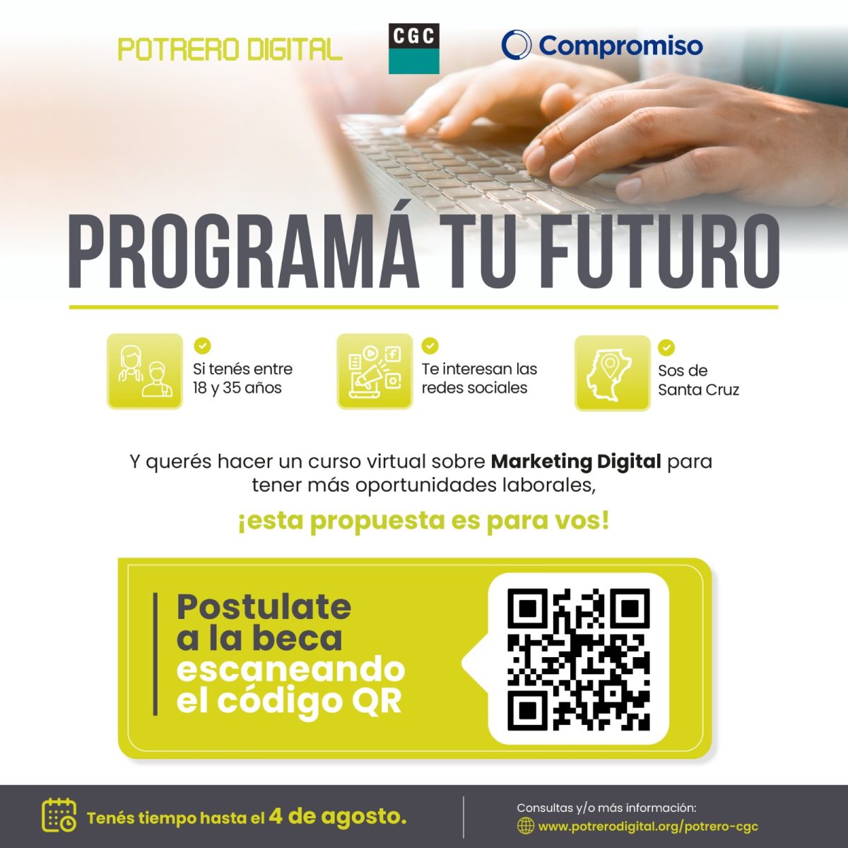 CGC lanzó una nueva edición de “Programá tu futuro“, su programa de becas destinado a jóvenes de la provincia de Santa Cruz que deseen formarse en oficios digitales para promover su empleabilidad. En esta edición, la convocatoria está abierta para el Nivel 1 del curso de Marketing Digital que comenzará en septiembre.