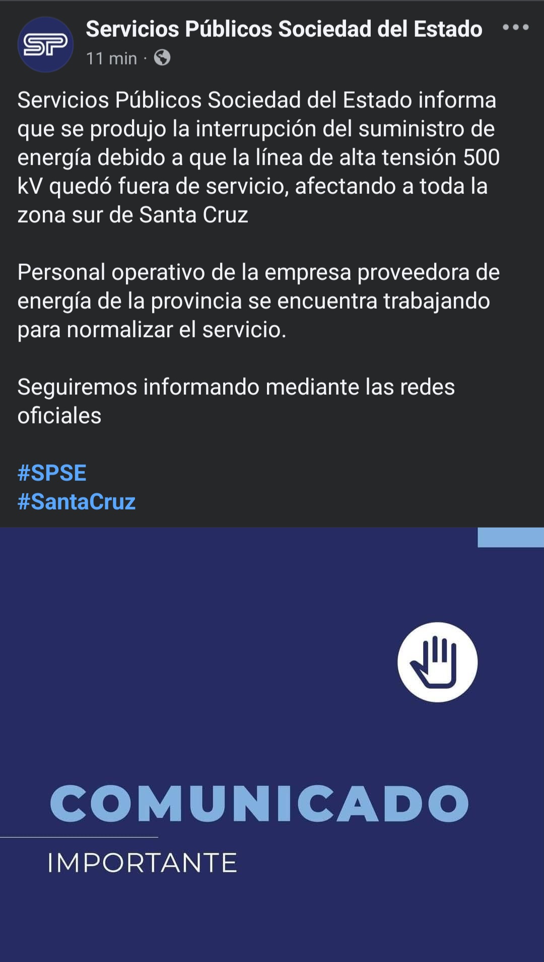 “Personal operativo de la empresa proveedora de energía de la provincia se encuentra trabajando para normalizar el servicio”, indicaron desde SPSE y aseguraron que seguirán ‘informando mediante las redes oficiales”. No obstante, aún no brindaron precisiones de cuándo regresará el suministro.