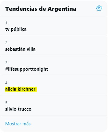 “Alicia Kirchner” se posicionó en cuarto lugar de la lista de ‘Trends’, y al ingresar al tema aparecían una serie de tuits haciendo referencia al mensaje que dejó por el natalicio del expresidente.
