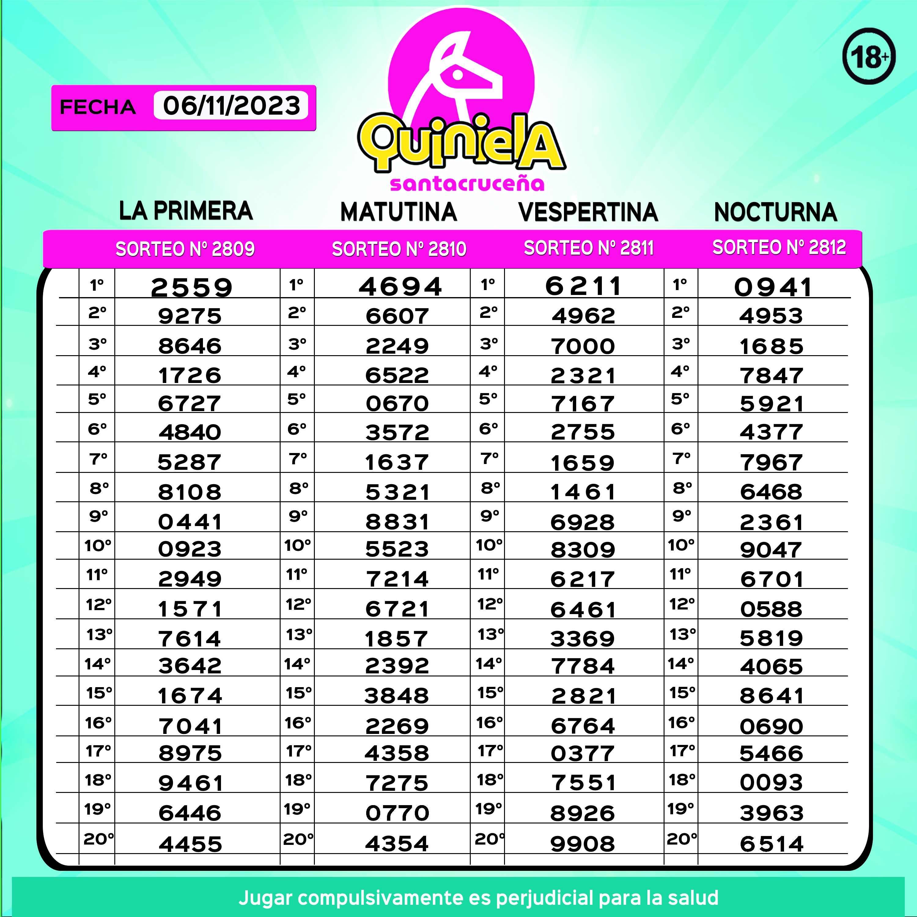 Este lunes 6 de noviembre de 2023, se llevaron a cabo los cuatro sorteos de la Quiniela Santacruceña: La Primera, Matutina, Vespertina y Nocturna, organizadas por la Lotería de Santa Cruz.