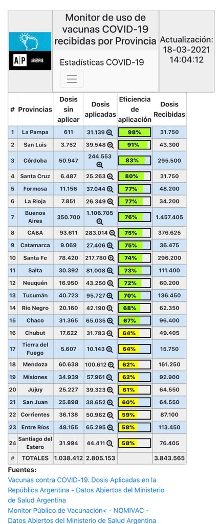 Según indica el portal, ya se aplicaron un total de 25.263 dosis, de las 31.750 que arribaron a la provincia hasta el momento. Otras 6.487 restarían por ser aplicadas. En porcentaje, se trata de un 80% de eficiencia de aplicación.