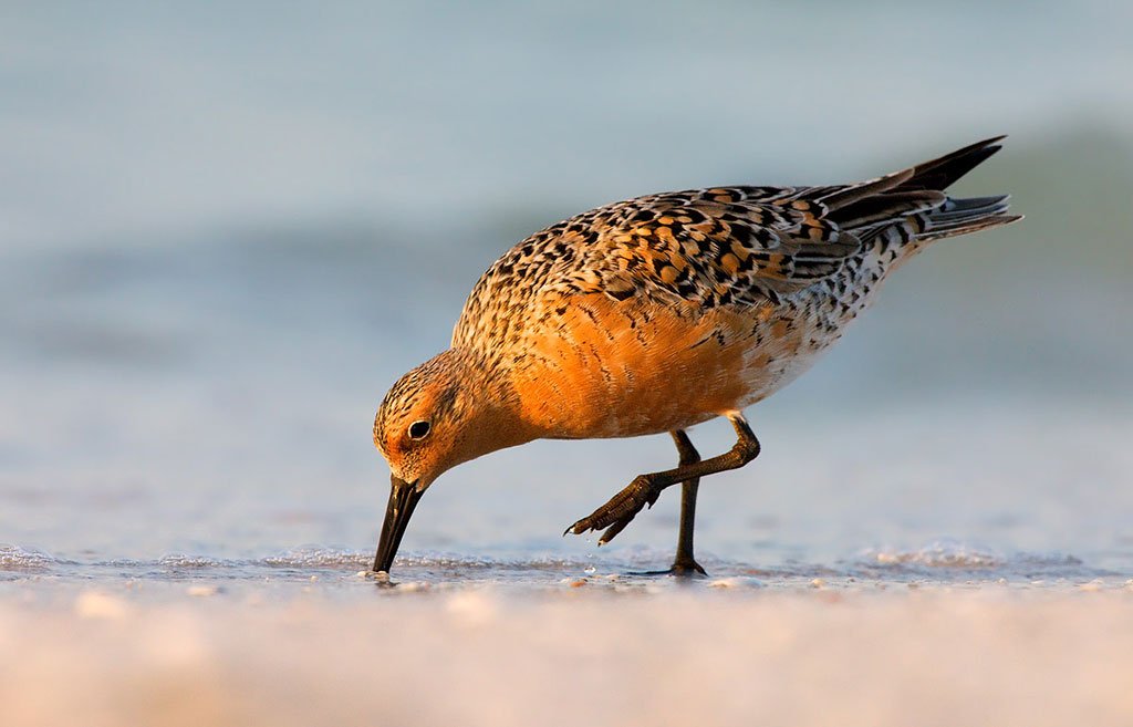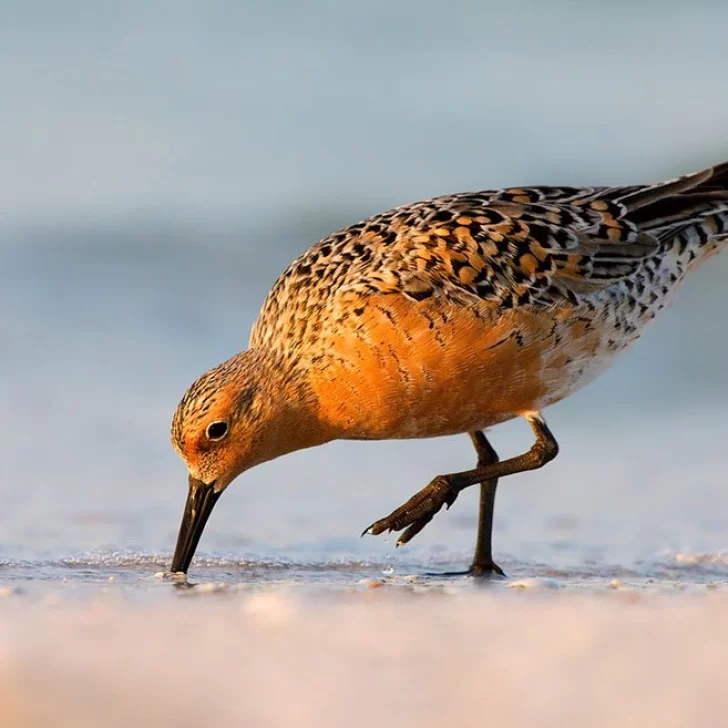 Una de las especies que se encuentran aquí en gran número es el playero rojizo (calidris canutus rufa), un playero de aspecto grande y robusto que mide aproximadamente 22 cm. Como todos los chorlos y playeros, presenta dimorfismo estacional. En el período no reproductivo, época en que se observa en nuestras costas, presenta un plumaje gris-pardo con manchitas negruzcas y tiene una ceja blanca. El vientre es de un blanco no muy puro y las patas y el pico son de color oliváceo. Los flancos y la rabadilla son barrados. El plumaje nupcial (primavera y verano boreal, aunque a veces observado a fines de nuestro verano, cuando comienzan a cambiar sus plumas) es de una coloración más llamativa, ya que el pecho se torna progresivamente rojizo.