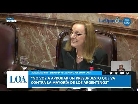 La senadora por la provincia de Santa Cruz, Alicia Kirchner (Fuerza Patria) tomó la palabra este viernes en el marco del debate del Presupuesto Nacional 2026 en el Congreso de la Nación. La exgobernadora adelantó su rechazo al mismo, al tiempo que fue crítica de la falta de apoyo del gobierno de Javier Milei a los distritos provinciales.