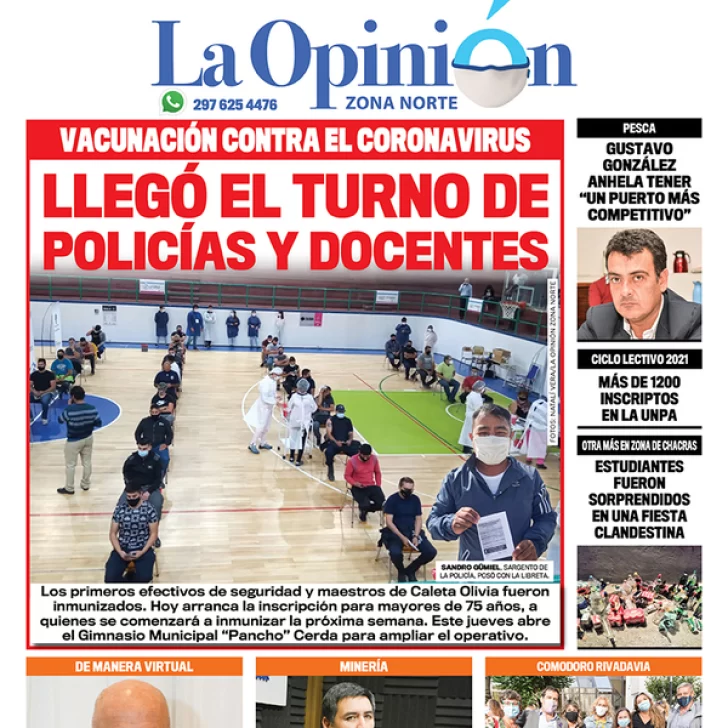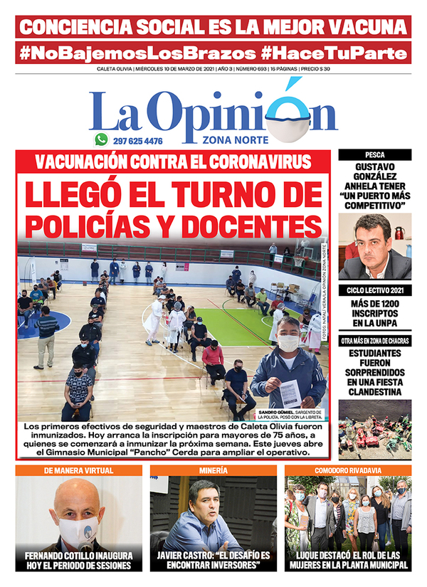 Los primeros efectivos de seguridad y maestros de Caleta Olivia fueron inmunizados. Hoy arranca la inscripción para mayores de 75 años, a quienes se comenzará a inmunizar la próxima semana. Este jueves abre el Gimnasio Municipal “Pancho” Cerda para ampliar el operativo.